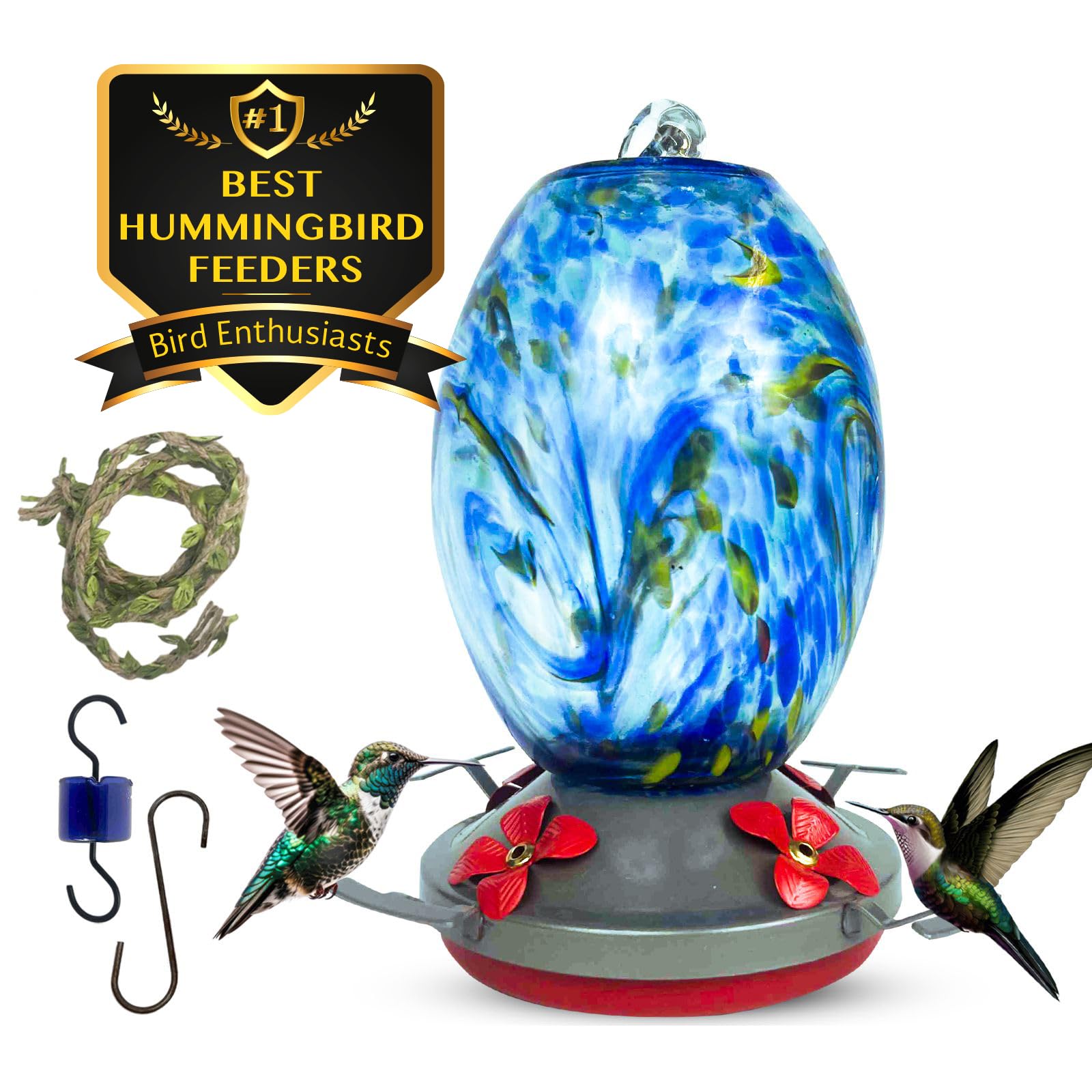 We love how its hand-blown glass construction not only adds a splash of sky blue elegance but also provides a perfect view of the nectar as hummingbirds dive in for a sip.